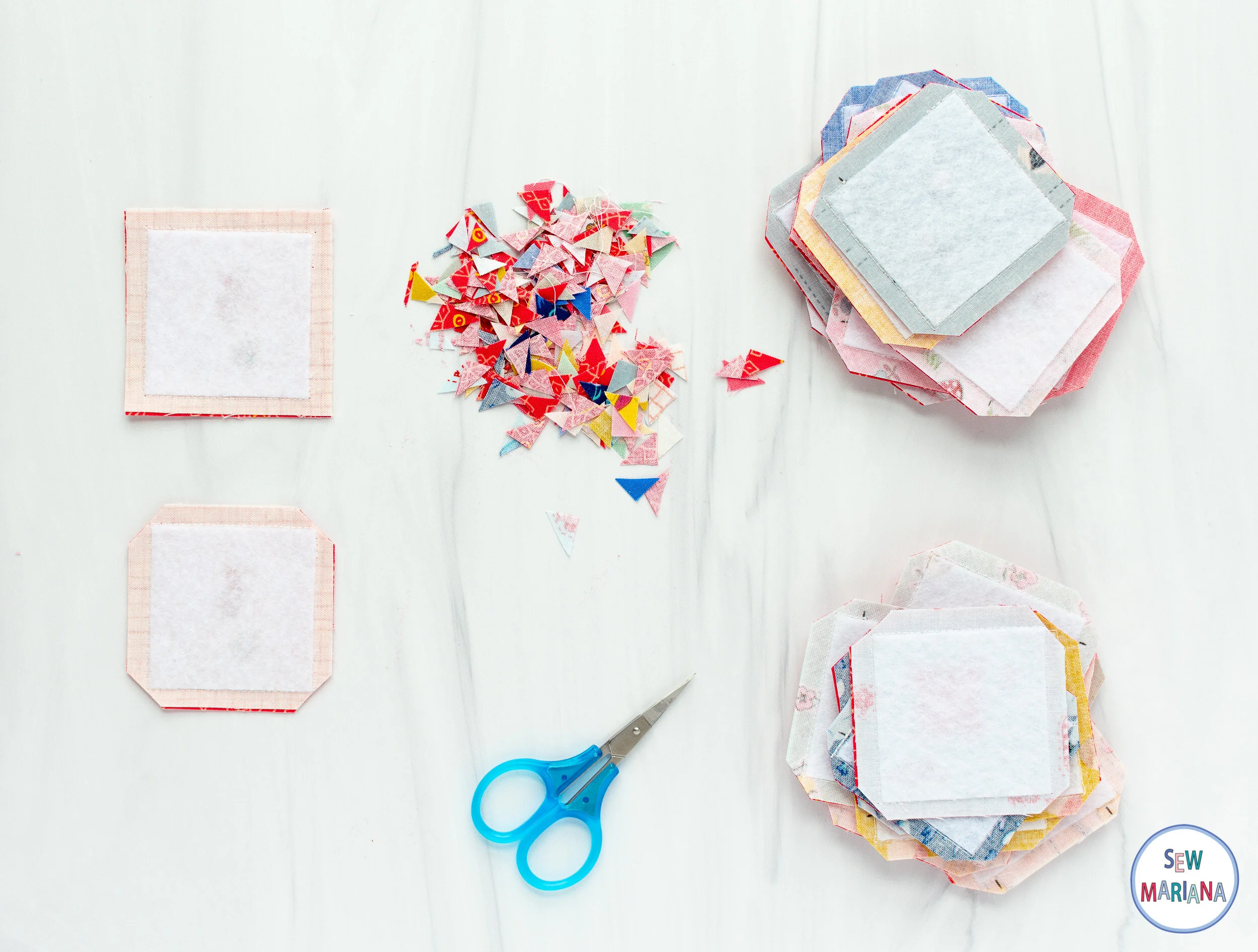 Keeping right sides together, align each backing square with a square of front fabric in pairs.