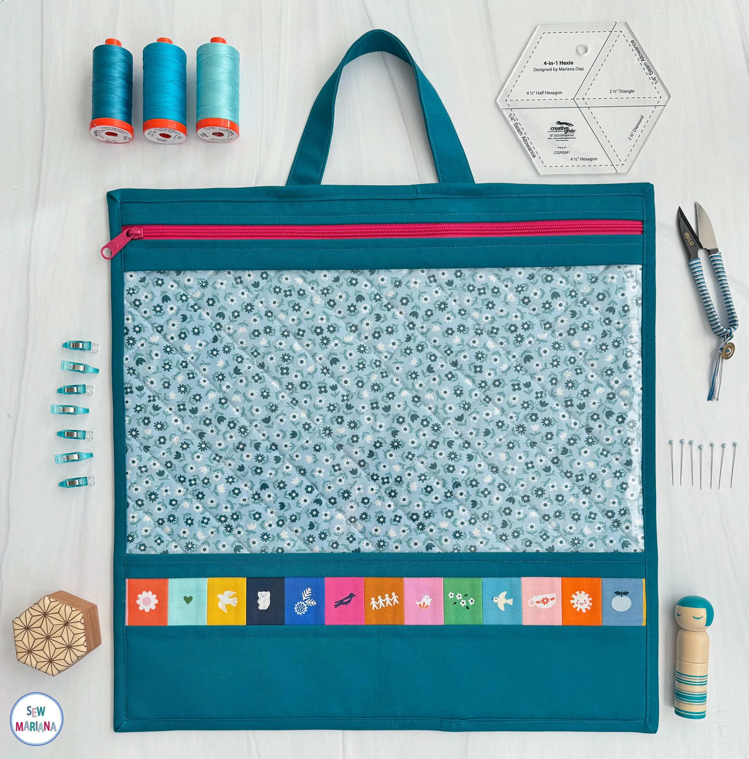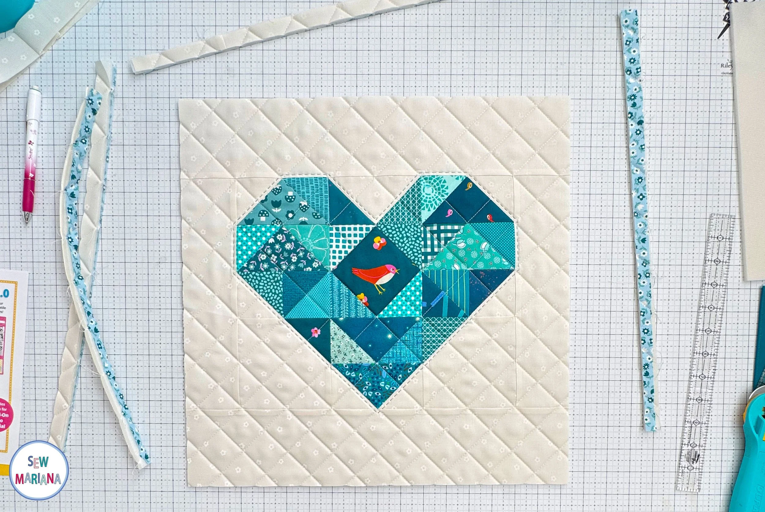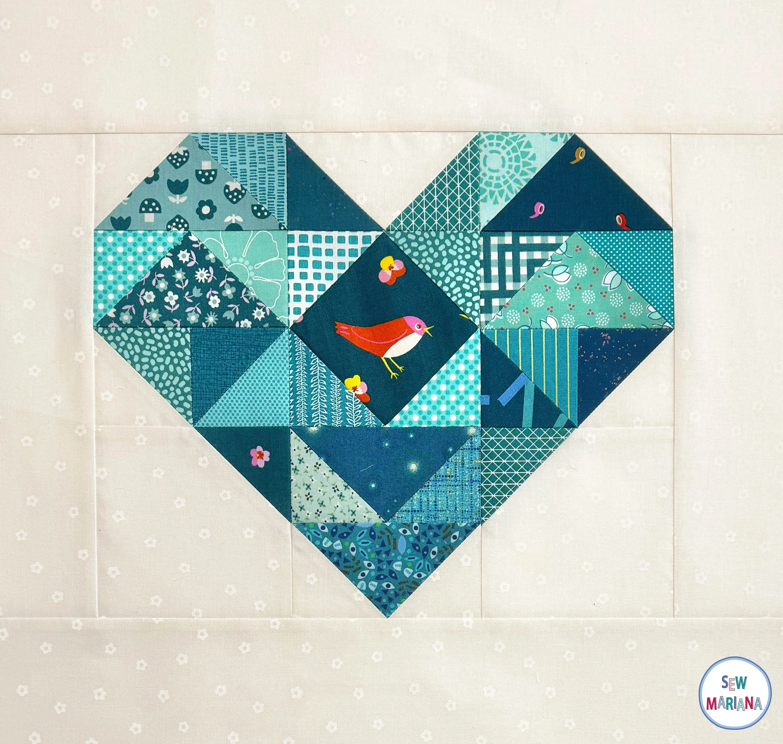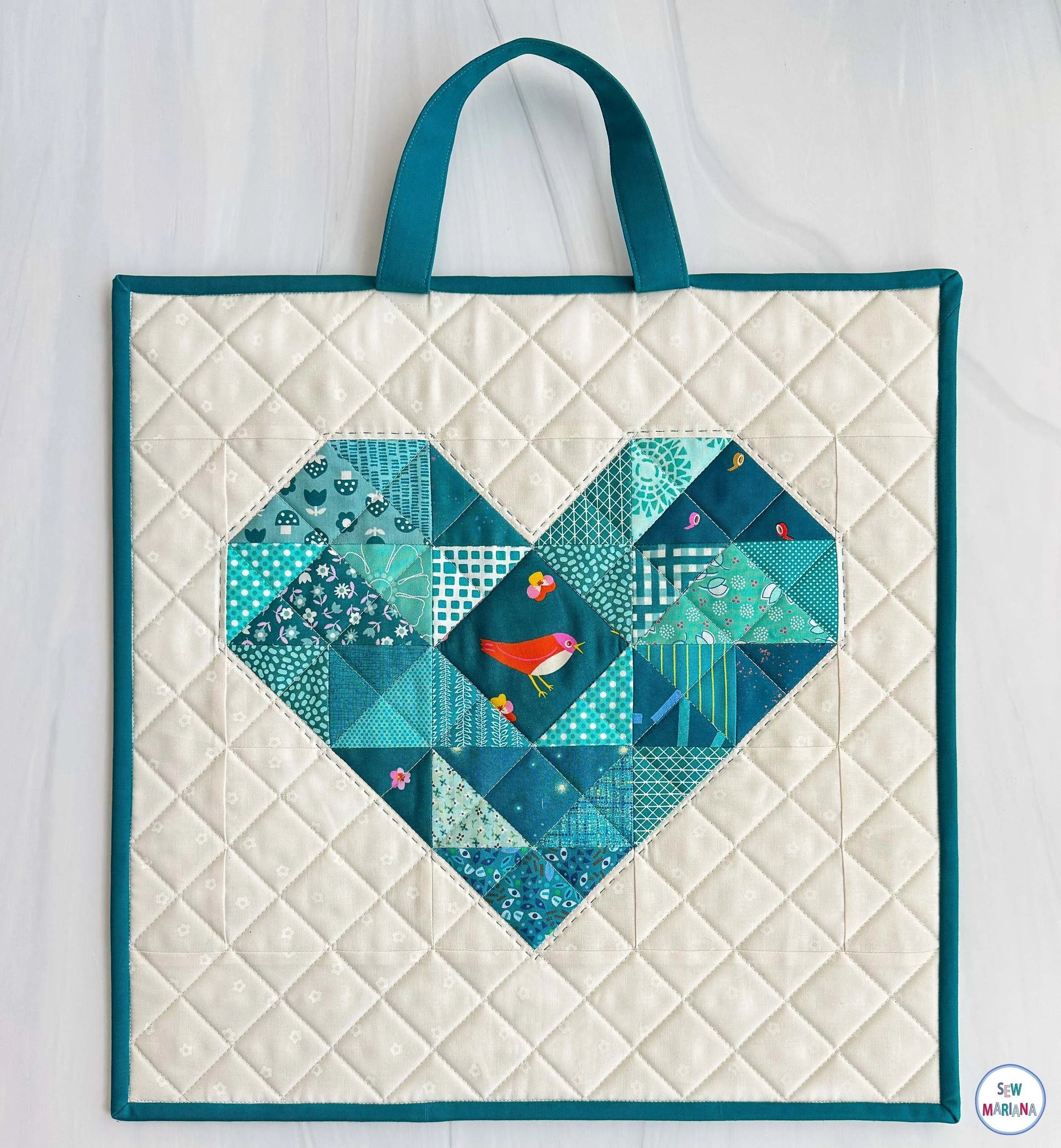 For my project this year, I made By Annie’s project bag. Basically, I went through every single piece of teal fabric I own, picked out my favorites (whether they were tiny scraps or pieces from untouched bundles), and made a smaller block version of my Heart Bits quilt to go on the back of the bag.